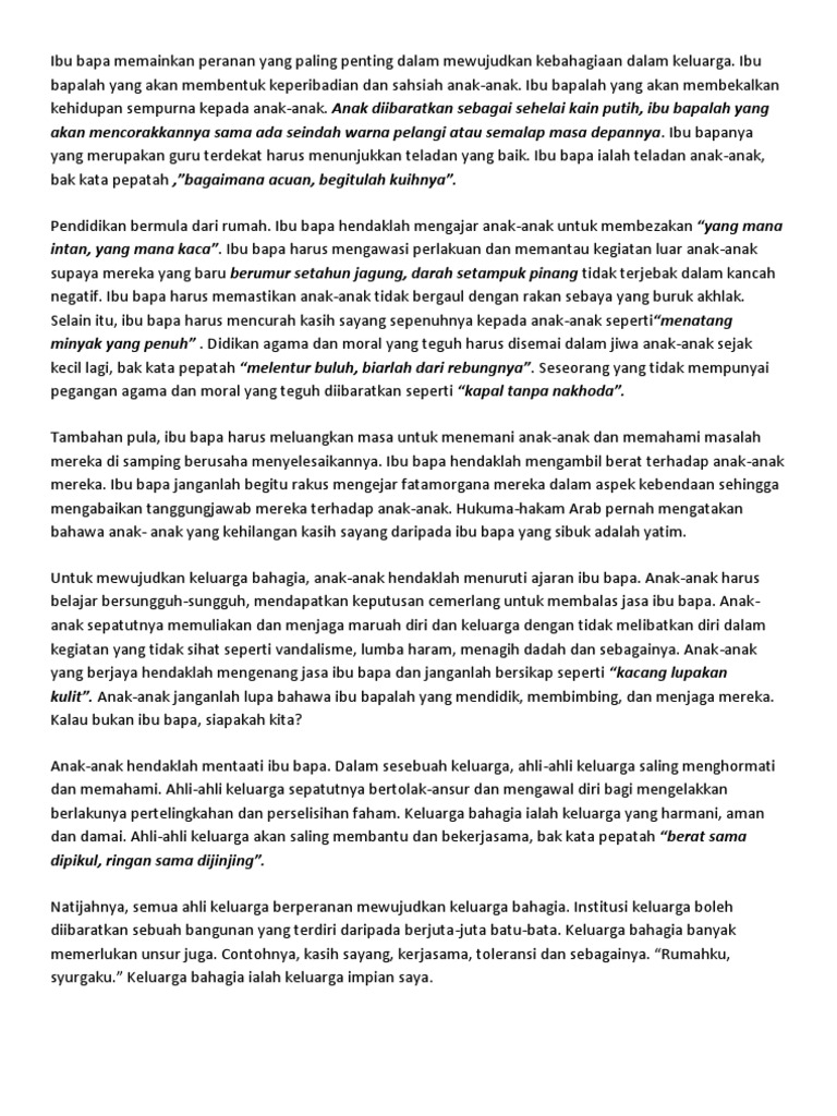 Kandungan Peranan Ibu Bapa dalam Membentuk Keluarga Bahagia memberikan didikan agama yang cukup mendidik anak-anak dengan penuh kasih sayang menyediakan suasana yang. CONTOH KARANGAN SPM PERANAN IBU BAPA UNTUK MEMBENTUK KELUARGA BAHAGIA Daripada keluarga terpancarnya sinar kasih sayang di antara ahlinya Daripada keluarga lahir rasa menghormati dan saling memerlukan yang tidak terucapkan Daripada keluarga lahirnya insan yang bertanggungjawab terhadap dirinya serta insan lain yang. Contoh Karangan Bahasa Melayu BM Kertas 1 SPM Keluarga Bahagia Masyarakat Sejahtera.